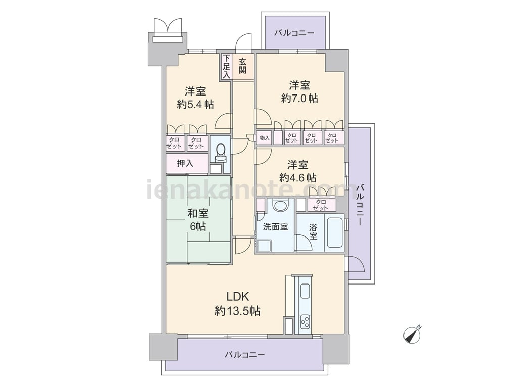 専有面積84.24平米の4LDK。専用ポーチ付きの、共用廊下に直接面した窓が無いプライバシーが確保されたプラン。LDKに隣接する和室の襖を開放すれば、約19.5帖大の家族団欒のスペースに。おもちゃを置いて小さい子どもの遊び場やお昼寝スペースにすれば、家事をしながら育児をするのに便利な一室としても使えます。バルコニーへの勝手口が付いたキッチンは、料理をしながら家族とコミュニケーションが取りやすいカウンタータイプ。各居室に収納スペースが付き。南東・北東・北西の3箇所にバルコニーがあります。