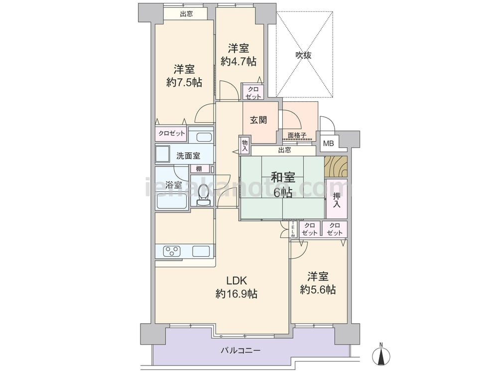 専有面積90.58平米の4LDK。玄関前に専用ポーチがあり、玄関から室内が見通せない造り。約16.9帖大のLDKにはコーナーサッシが用いられ、明るく・開放感があります。キッチンはカウンタータイプで家事をしながら家族とコミュニケーションが取りやすい配置。洋室約5.6帖へはLDKを通ってアクセスするため、子供部屋として利用すれば顔を合わせる機会が増えて安心です。各居室と室内廊下に収納スペースがあり、LDKにはTEL台付き。バルコニーは約13.48平米の広さがあり、ガーデニングを楽しむのにぴったりです。
