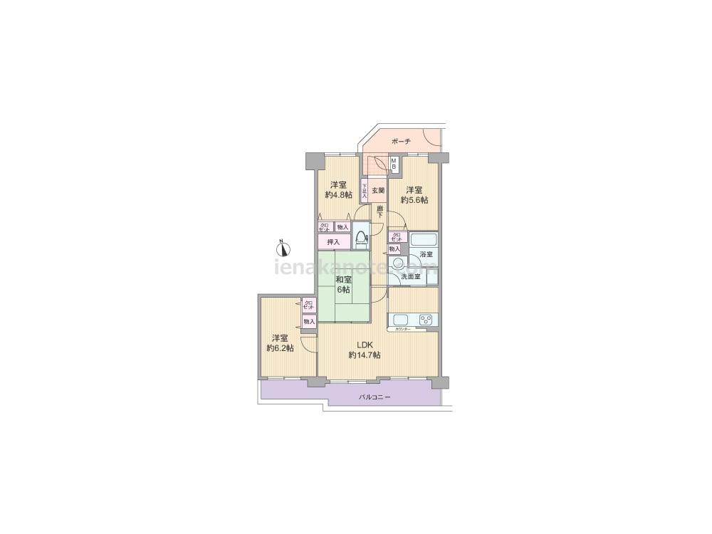専有面積78.95平米の4LDK。玄関前に専用ポーチがあり、共用廊下に直接居室が面していない為、プライバシーが確保されています。ワイドスパンのプランで、南面3カ所に窓付き。LDKに隣接する和室の襖を開放すれば、約20.9帖大の空間としても使えます。カウンタータイプのキッチンは料理中も家族とコミュニケーションが取りやすく、キッチンから洗面室へアクセス可能な家事効率の良い配置。各居室に収納スペースがあり、室内廊下にも物入があります。
