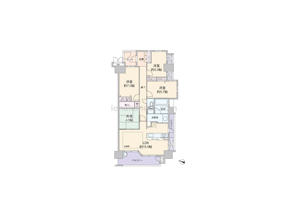 専有面積86.43平米の4LDK。玄関前に専用ポーチがあり、共用廊下に直接面した窓が無いプライバシー重視のプラン。LDKは開放感のあるコーナーサッシと二面採光で明るく開放的。LDKと続き間になった和室は廊下からもアクセスできるため、客間に利用したり、襖を開放して約20.0帖大のくつろぎのリビングスペースとして利用するなどフレキシブルに使える一室。カウンタータイプのキッチンは家事をしながら家族とコミュニケーションが取りやすく、キッチン横のバルコニーは一時的にゴミを置いておくのに便利。各部屋に収納スペースが設けられ、西側のバルコニーにはトランクルーム付き。スロップシンクはガーデニングでの利用はもちろん、キッチンの流し台や洗面室では洗いにくい汚れ物などを扱うのにも適しています。