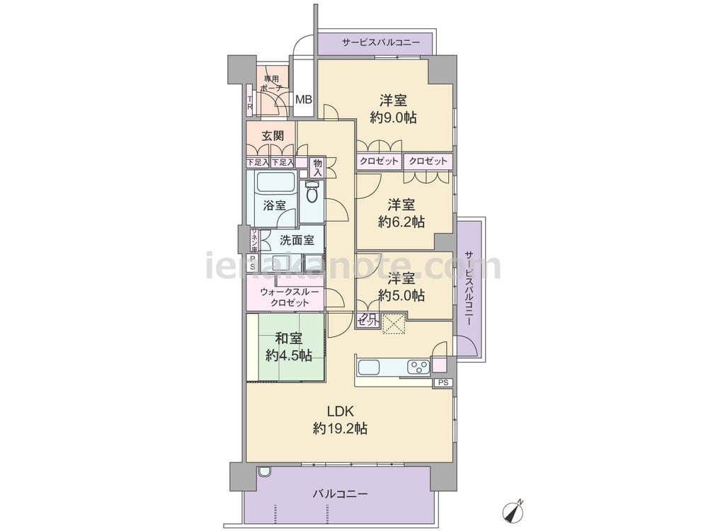 専有面積101.83平米の4SLDK。玄関前にポーチがあり、ポーチ内にトランクルーム付き。室内への動線がクランク状になったプライバシーに配慮されたプラン。LDKと主寝室約9帖は開放感のある2面採光。キッチンはカウンタータイプで、便利な勝手口付き。各部屋の収納スペースの他、納戸もあります。3カ所にバルコニー付き。南側のバルコニーは出幅があり、ガーデニングスペースやアウトドアリビングとしても使えます。