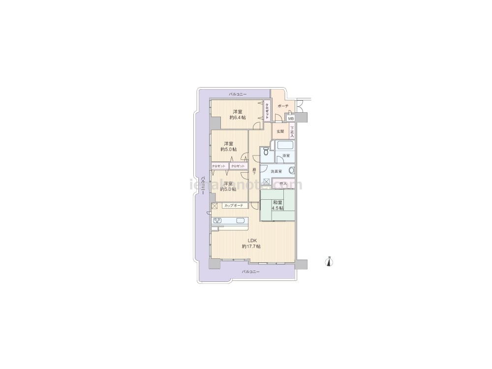 専有面積86.65平米の4LDK。玄関前に専用ポーチがあり、共用廊下に直接面する居室が無い、プライバシーが確保されたプラン。LDK約17.7帖大は2面採光で明るく・開放感があります。カップボード付きのキッチンは、家事をしながら家族とコミュニケーションが取りやすいカウンタータイプで、キッチン横にバルコニーへの勝手口もあります。和室4.5帖は2カ所から出入りでき、各居室に収納スペース付き。北・西・南の三方に面したバルコニーは約32.52平米大の広さがあり、ガーデニングを楽しんだり、テーブルセットを出して食事やお茶を楽しむのによさそうです。