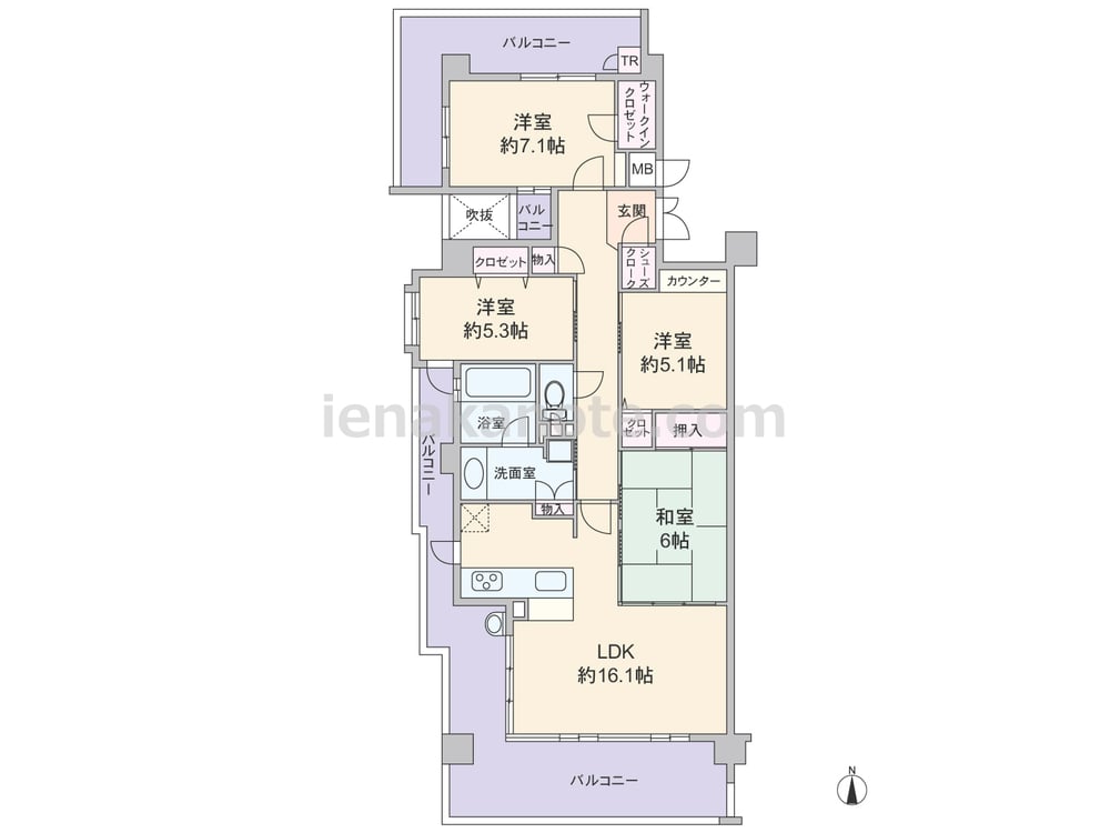 専有面積92.55平米の4LDK。玄関前に専用ポーチがあり、共用廊下に直接面する居室の窓が無い、プライバシー重視のプラン。LDKは約16.1帖大の広さがあり、キッチンは作業しながら家族とコミュニケーションが取りやすいカウンタータイプ。キッチン横にはバルコニーへの勝手口があります。和室6帖は2カ所から出入りが可能。LDK側の襖を開放すれば約22.1帖大の広々とした空間としても使えます。各居室に収納スペース付き。主寝室約7.1帖にはウォークインクロゼット、玄関横にはシューズクロークが設けられ収納スペースが充実。浴室に窓があるのもポイント。北・西・南の三方にバルコニーがあり、トランクルームやスロップシンクも付いているため、ガーデニングを楽しむのにぴったりです。
