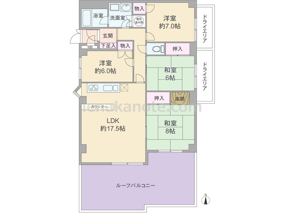 専有面積96.60平米の4LDK。ルーフバルコニー約32.4平米大が付いたプラン。玄関前にはプライバシーに配慮された専用ポーチがあります。LDKはゆとりの約17.5帖大。和室8帖の襖を開放すれば、リビングダイニングをより広々と使用出来ます。キッチンは壁付け・オープンタイプで、背面に便利なカウンター付き。各部屋に収納スペースが設けられています。ルーフバルコニーではガーデニングや家庭菜園をしたり、テーブルセットを置いてアウトドアリビングにするなど様々な使い方が出来ます。