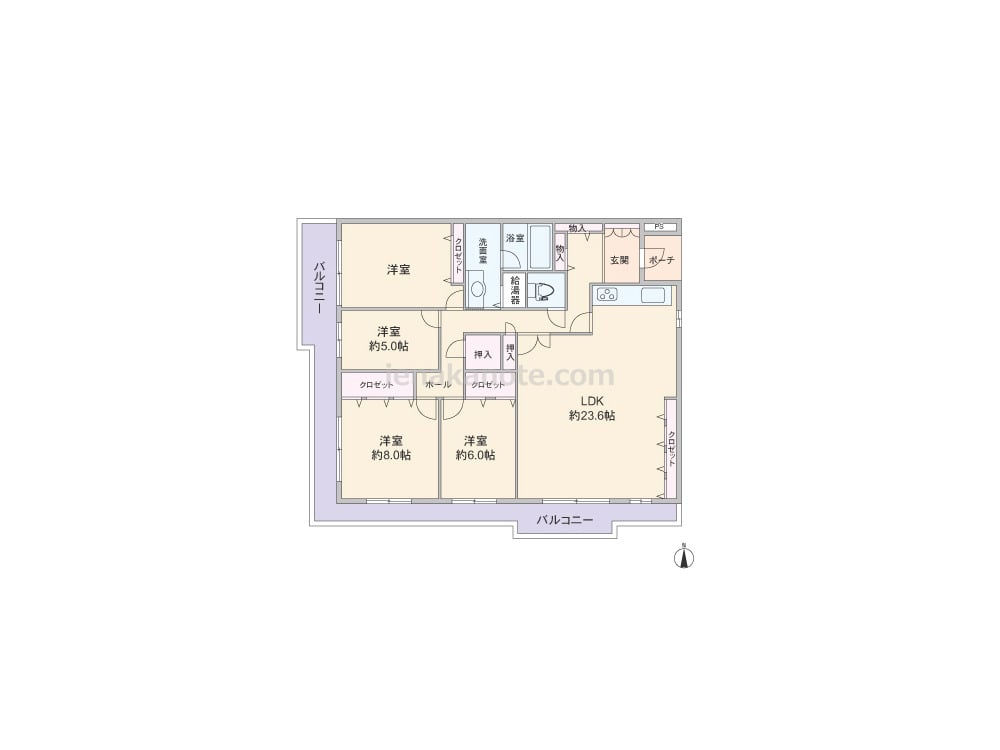 専有面積119.57平米の4LDK。全部屋バルコニーに面したプラン。玄関から居室が見通せない、プライバシーに配慮された造り。LDKは約23.6帖大とゆとりがあり、日用品などを収納するのに便利なクロゼットもあります。洋室約5.0帖には収納スペースが無いため、室内廊下の物入を活用したり、収納家具を置くなどの工夫が必要。バルコニーは約28.98平米大と広く、テーブルセットを置いたり、ガーデニングを楽しむのによさそうです。