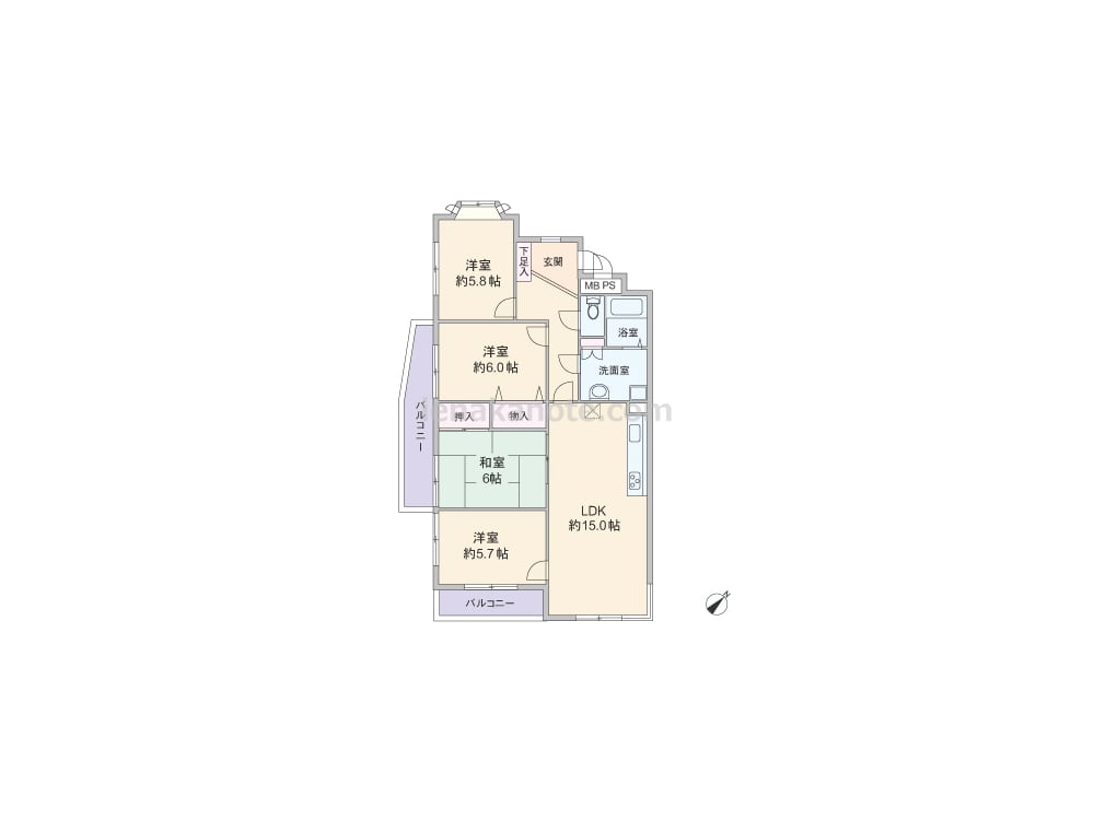 専有面積83.10平米の4LDK。玄関は居室を直接見通せない造りで、通風・採光にも配慮された窓があります。LDK約15.0帖と和室6帖が続き間になっており、洋室約5.7帖もリビングからアクセスする造り。キッチンはI型の壁付け・オープンタイプです。収納スペースは和室6帖と洋室約6.0帖に設けられています。2カ所あるバルコニーは、ガーデニングを楽しむのにもよさそうです。