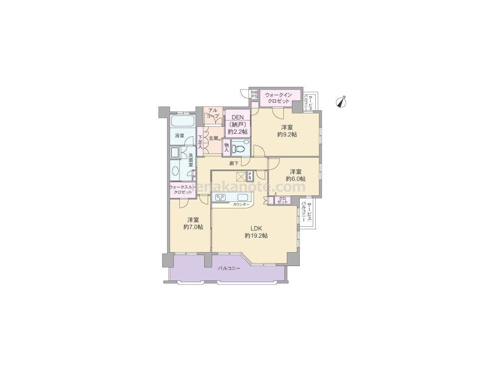 専有面積100.78平米の4LDK。全室6帖以上のゆとりがあるプラン。玄関前にはアルコーブがあり、玄関横には約2.2帖のDEN(納戸)があります。LDK約19.2帖大には明るく・開放感のあるコーナーサッシが用いられ、キッチンは作業をしながら会話を楽しめるカウンタータイプ。収納スペースが各所にあり、洋室約7.0帖のウォークスルークロゼットを通って洗面室へアクセス出来ます。浴室の窓は換気がしやすく快適。バルコニーは約12.42平米の広さがあります。