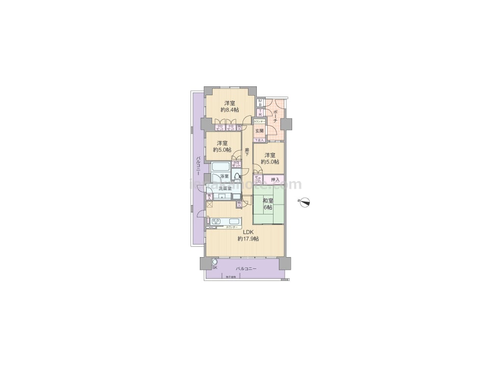 専有面積93.29平米の4LDK。玄関前にはポーチ付き。直接共用廊下に面した窓がなく、プライバシーに配慮されたプランです。キッチンはカウンタータイプで家事をしながら家族の様子を窺うことができる配置。キッチンと洗面室には勝手口、浴室には窓があります。バルコニーにはスロップシンク付きです。