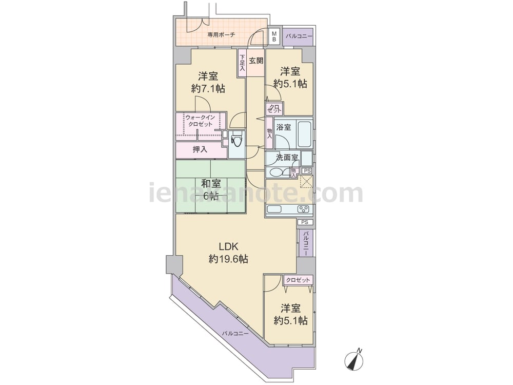 専有面積94.55平米の4LDK。玄関前には専用ポーチ付き。共用廊下に直接面した窓がなく、プライバシーを確保しやすいプラン。合計3カ所にバルコニーがあり、キッチンや浴室、洗面室にも窓があります。各部屋に収納スペース付きで、洋室約7.1帖にはウォークインクロゼットがあるなどが収納豊富です。