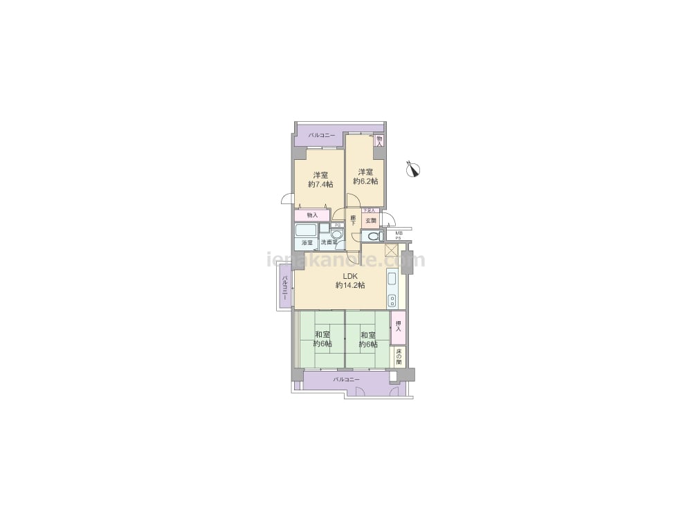 専有面積85.21平米の4LDK。居室の窓が共用廊下に直接面していない、プライバシーに配慮された造り。センターリビングのプランでLDKは約14.2帖、キッチンはI型の壁付け・オープンタイプ。南西側の和室には収納スペースがありませんが、家具を置くのに便利な板間があります。全3カ所あるバルコニーは約18.2平米の広さがあり、ガーデニングなどもたっぷり楽しめそうです。