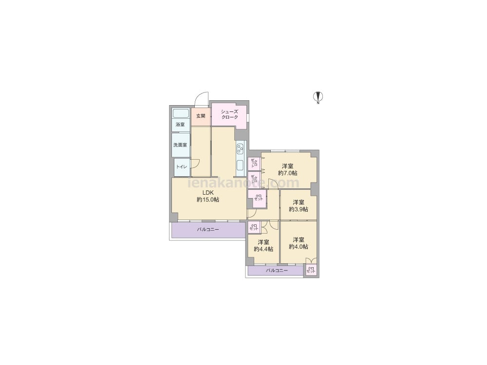 専有面積107.19平米の4LDK。リビングを通って各居室に行き来する、家族のコミュニケーションの機会が増えるプラン。玄関横には収納力のあるシューズクローク付き。リビングダイニングとキッチンが分かれているため、リビングスペースはくつろぎの空間を演出できます。洋室約3.9帖は書斎やウォークインクロゼットなどの利用によさそう。バルコニーが2カ所あり、ガーデニングをたっぷり楽しめます。
