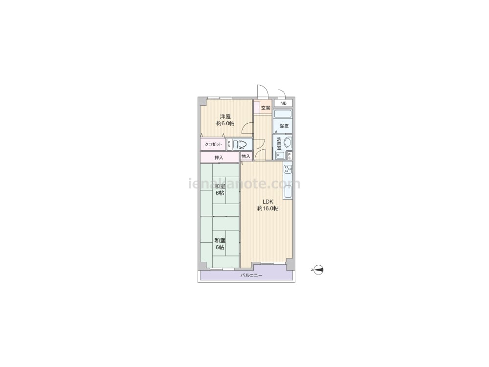 専有面積74.79平米の3LDK。どの部屋も6帖のゆとりがあるプラン。LDKと和室二部屋が続き間になっており、襖を開放すれば空間を広々と使う事が出来ます。キッチンは壁付け・オープンタイプ。バルコニーに面する和室には収納スペースが無いため、場合によっては家具の設置が必要です。