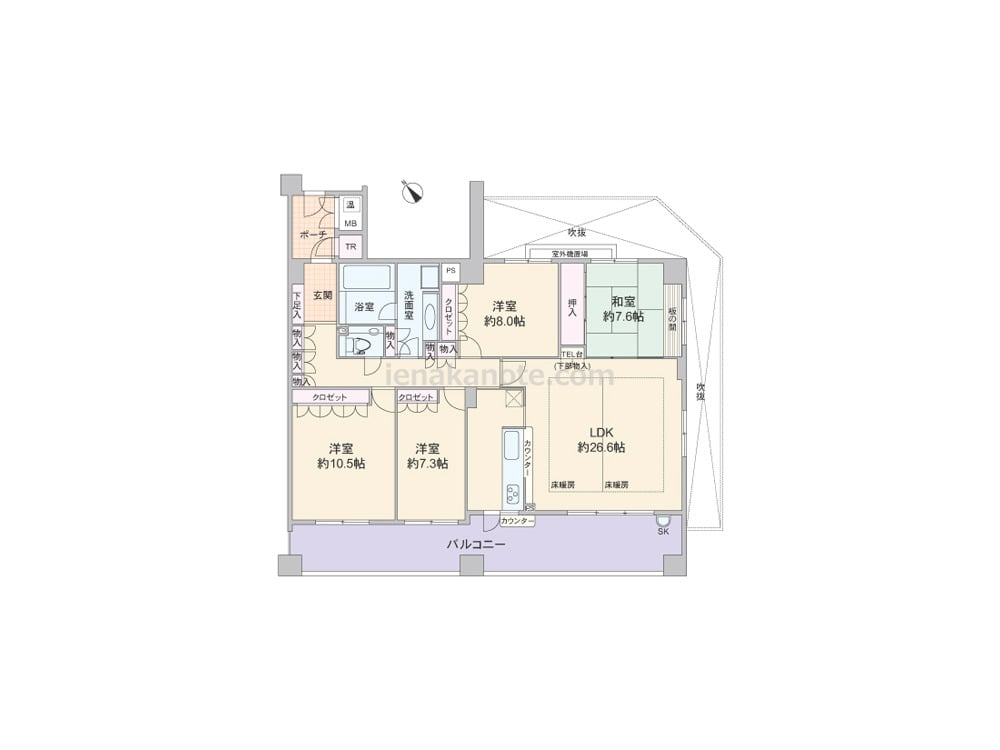 専有面積135.24平米の4LDK。どの部屋も7帖以上の広さがある、ワイドスパンのプラン。玄関前には専用ポーチとトランクルームがあり、居室の窓が共用廊下に面していないため、プライバシーを保つことが出来ます。LDKは約26.6帖大と広く、和室の襖を開放すれば約34.2帖大の空間としても使用可能。対面・カウンタータイプのキッチン横には、バルコニーへの勝手口付き。居室以外にも収納スペースが豊富に設けられ、トイレ内には手洗いカウンターがあります。バルコニーは約30.35平米と大変広く、テーブルセットを置いてアウトドアリビングにしたり、ガーデニングや家庭菜園を楽しむのによさそうです。