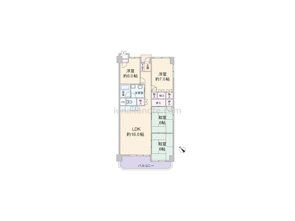 専有面積93.27平米の4LDK。どの部屋も6帖以上の広さが確保されたプラン。LDK約16.0帖と和室2部屋が続き間になっており、生活シーンに合わせて自由にレイアウト変更出来ます。バルコニーに面する和室以外に収納スペース付き。トイレは洗面室を通って出入りするため、トイレ・洗面室使用時の動線が重なっています。