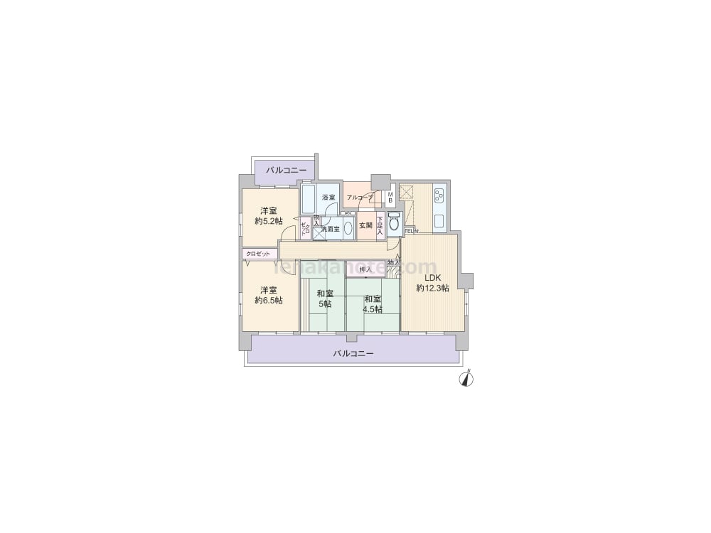 専有面積75.05平米の4LDK。ワイドスパン、両面バルコニーのプランで、キッチン以外の全居室がバルコニーに面しています。玄関先から室内を直接見通せない造りでプライバシーを確保。LDKは約12.3帖、独立型のキッチンは、リビング・ダイニングに生活感が伝わりにくいのが特徴です。和室4.5帖はLDKと和室5帖の二方向からアクセスし、襖を開放すれば空間を広く使う事が出来ます。和室5帖には収納スペースがありませんが、家具を置くのに便利な板間付き。浴室はバルコニーに面して窓があります。バルコニーは約22.38平米とゆとりがあり、ガーデニングなどもゆったり楽しめそうです。