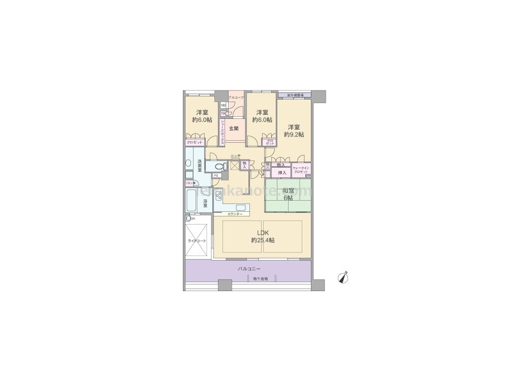 専有面積117.02平米の4LDK。玄関前にアルコーブとトランクルームがあり、玄関ホールには雑貨や写真を飾れるニッチ付き。LDKに隣接する和室の襖を開放すれば、約31.4帖大の空間としても使用出来ます。キッチンはL字型の対面・カウンタータイプで、洗面室にも行き来が可能な2WAY動線。浴室の窓は換気がしやすく快適。ライトコートにはスロップシンクが設けられています。バルコニーは約23平米と広く、ガーデニングを楽しんだり、テーブルセットを置いて食事やティータイムを過ごすカフェテラスにしてもよさそうです。