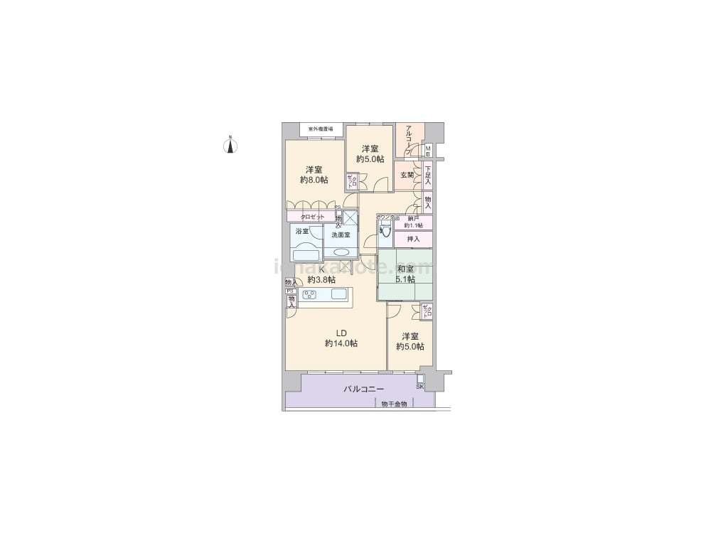 専有面積95.98平米の4LDK。玄関前にアルコーブがあり、玄関先から室内を見通せない、プライバシーに配慮された造り。LDK約17.8帖には和室5.1と洋室約5.0帖が隣接しており、洋室約5.0帖を子ども部屋にすれば、自然と顔を合わせる機会が増えます。キッチンは作業中もリビング全体を見渡せる対面タイプ。各居室に収納スペースがあり、玄関ホールにも納戸付き。スロップシンク付きのバルコニーは約15.72平米とゆとりがあり、ガーデニングを楽しんだり、テーブルセットを置いてくつろぎのひと時を過ごすのもよさそうです。