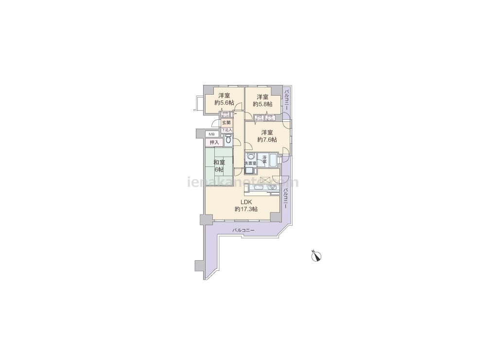 専有面積88.05平米の4LDK。センターインのプラン。LDKは約17.3帖、キッチンは作業をしながら家族と会話を楽しめる対面カウンタータイプ。和室はLDKと室内廊下の2カ所から出入りでき、来客時には客間にしたり、LDK側の襖を開放して約23.3帖大の空間にするなど、生活シーンに合わせて使い分けできます。クロゼットは容量が少ないため、場合により家具を置くなどの工夫が必要です。浴室には窓があり、湿気がこもりにくく快適。バルコニーは約23.29平米の広さがあります。
