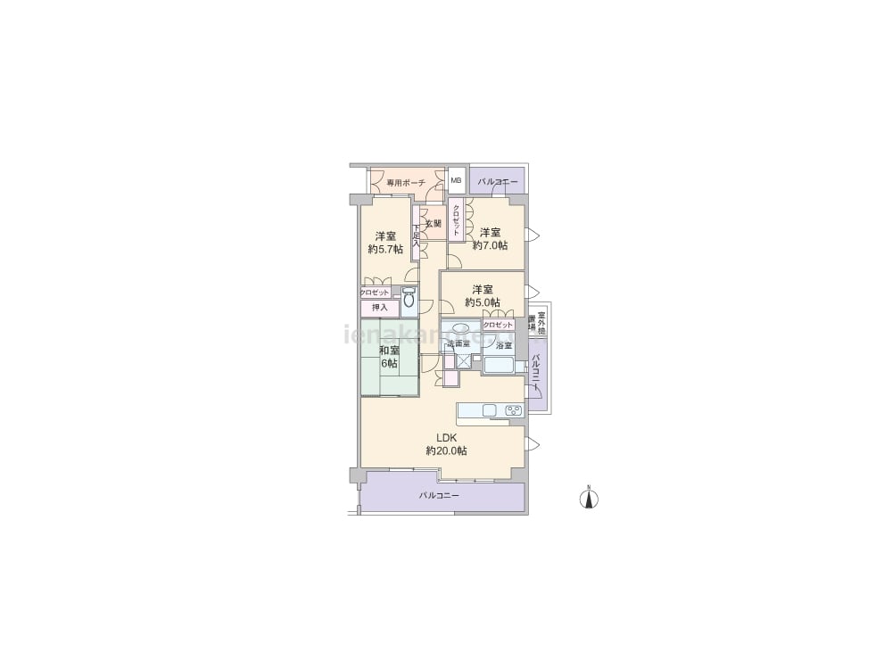 専有面積95.97平米の4LDK。玄関前に専用ポーチがあり、居室の窓が共用廊下に面していない、プライバシー重視のプラン。LDKは約20.0帖大と広く、和室の襖を開放すればより広々と空間を使う事が出来ます。明るく開放感のあるコーナーサッシが用いられているのもポイントです。対面カウンタータイプのキッチンはバルコニーへアクセス可能。浴室の窓は湿気がこもりにくく快適です。バルコニーは全部で3カ所あります。