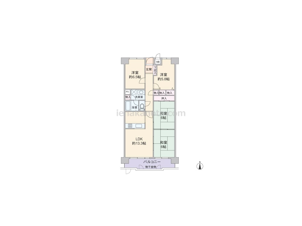 専有面積79.77平米の4LDK。LDK約13.3帖と和室二間が続き間になったプラン。それぞれ個室の利用はもちろん、襖を開放すれば空間を広々と使う事が出来ます。対面カウンタータイプのキッチンは作業中も家族と会話を楽しめる配置。バルコニーに面する和室6帖と洋室約6.5帖には収納スペースが無いため、場合により家具の設置が必要です。