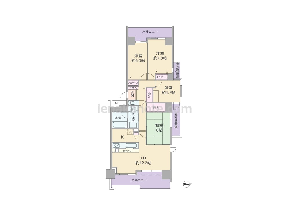 専有面積86.69平米の4LDK。センターインタイプの玄関は正面に物入があり、室内を直接見通せない造りでプライバシーを確保。キッチンは対面・カウンター式。和室はリビング・ダイニングと廊下の2カ所から出入りできます。各居室に収納スペース付き。東西両面にバルコニーがあり、約17.85平米の広さがあります。