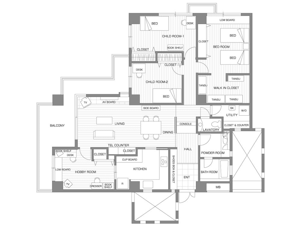 玄関横には収納力のある収納があり、ホール正面の飾り棚はフラワーアレンジや小物のディスプレイを楽しむ事が出来ます。リビングは開放的なコーナーサッシが用いられ、独立型のキッチンはリビング・ダイニングへ料理のにおいや煙、生活感が伝わりにくい造り。ホビールームはリビング・キッチンの2カ所からアクセス可能な2WAY仕様。ユーティリティー(洗濯機置場)と洗面室が分かれて配置されているため、ゆったりと家事、身支度をする事ができ、浴室も含めて吹抜に面して換気に配慮された窓があります。各居室に収納が確保され、主寝室は大容量のウォークインクロゼット付きです。