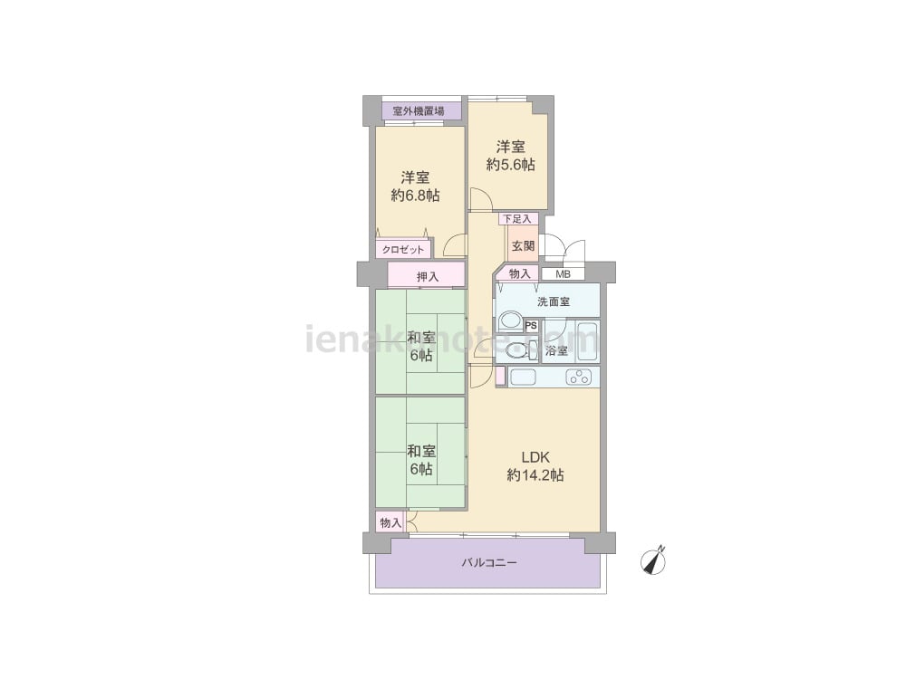 専有面積83.48平米の4LDK。センターインプラン。LDKと和室6帖が続き間で、くつろぎのリビングスペースによさそうです。キッチンは開放的なウォールタイプ。洋室約5.6帖にはクロゼットが無いため、家具を置くなど少し工夫が必要です。洗面室の物入はタオルや洗剤を収納するのに便利。バルコニーは約12.92平米の広さがあります。