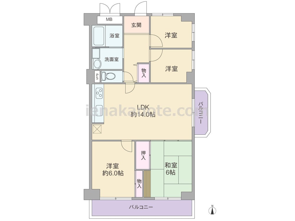 専有面積72.45平米の4LDK。センターリビングのプランで、リビング・ダイニングにもバルコニー付き。LDKと6帖和室、約6帖洋室の2部屋が続き間。生活シーンに合わせてフレキシブルに使えます。