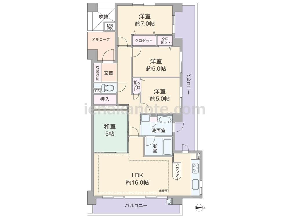 専有面積85.06平米の4LDK。玄関前にはアルコーブがあり、室内廊下はクランク型になっているなど、プライバシーに配慮されたプラン。バルコニーは北・東の2面にあります。キッチン横には使い勝手の良いカウンターや、バルコニーへ出られる勝手口付き。洗面室・浴室に窓があり、換気がしやすく家事効率も良いです。