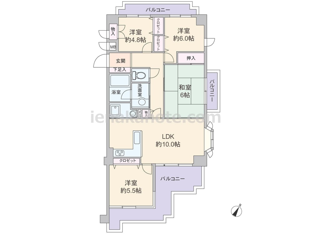 専有面積75.26平米の4LDK。センターインで、共用廊下に直接面する居室の無いプライバシー重視のプラン。リビングは明るい2面開口。キッチンはカウンタータイプのL字型で、キッチン横には洗濯機置場があり、家事動線にも優れています。リビングと続き間の和室は、襖を開ければLDK約16.0帖大に。全室に収納スペース付きです。3面にバルコニーがあり、開放的。南側バルコニーは広く、ガーデニングなども楽しめます。