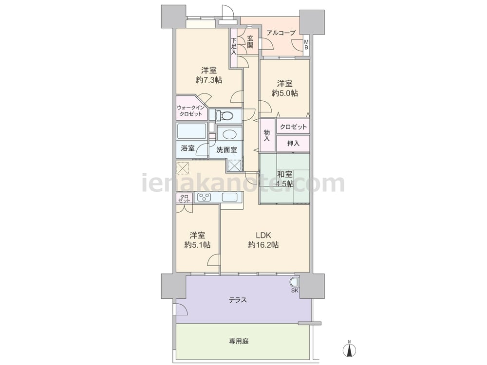 専有面積86.32平米の4LDK。玄関前にアルコーブがあり、プライバシーに配慮されたプラン。テラスと専用庭は子供の遊び場やガーデニングスペースにぴったりです。リビングに隣接した洋室はバルコニーに面し明るく、子供部屋として使えば必ずリビングを通って出入りするため、家族のコミュニケーションの機会が増えそうです。主寝室は7.3帖とゆとりの広さ。各室に収納があり、ウォークインクロゼットやトランクルームもあるなど収納スペースが充実しています。
