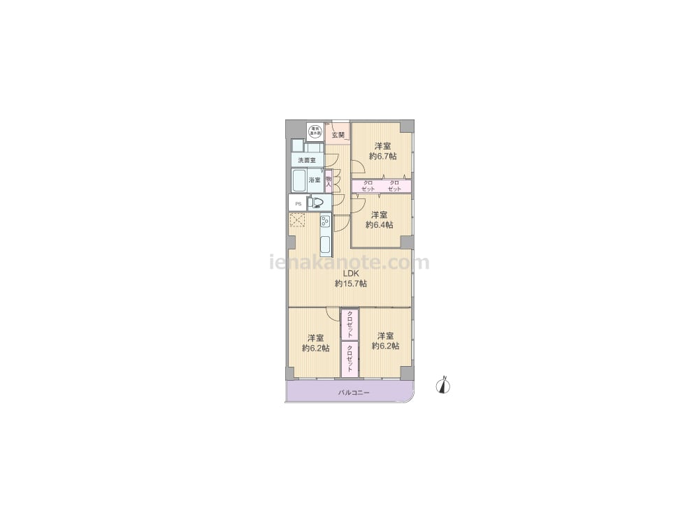 専有面積86.45平米の4LDK。玄関扉は内開きのため玄関スペースは限られますが、防犯面ではすぐれています。居室の窓が共用廊下に面していないのもポイントです。どの部屋も6帖以上のゆとりがある、センターリビングのプラン。LDKは約15.7帖、隣接する洋室の扉を開放すれば、空間をより広く使う事が可能。各居室と室内廊下に収納スペースが設けられています。