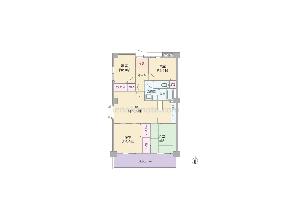 専有面積90.19平米の4LDK。LDKが部屋の中央にあるセンターリビングのプラン。洋室約8.0帖の扉を開放すれば、LDK約23.3帖大に。キッチンはリビング・ダイニングと空間が仕切られているため、リビング・ダイニングはくつろぎの空間を保つことが出来ます。各居室と玄関ホールに収納スペースがあり、トイレは洗面室を通って出入りする造り。バルコニーは約11.55平米あります。
