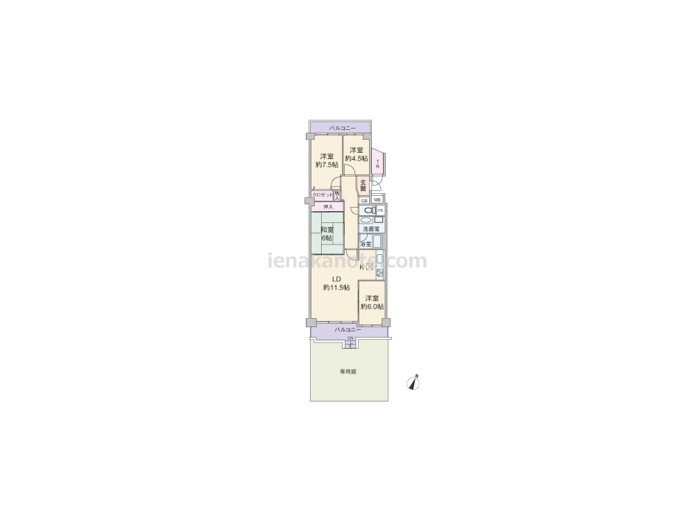 専有面積86.52平米の4LDK。専用庭やトランクルームがあるプラン。LDKには洋室約6.0帖と和室6帖が隣接しており、建具を開放すれば空間をより広々と使う事が出来ます。和室は室内廊下からも出入りでき、客間などにも利用可能。キッチンは奥まって配置されているため、リビング・ダイニングはくつろぎの空間を保つ事ができます。洋室約4.5帖と洋室約6.0帖には収納スペースが無いため、家具を置くなど少し工夫が必要。専用庭は約27平米あり、ガーデニングや家庭菜園、アウトドアリビングなど色々な楽しみ方が可能です。