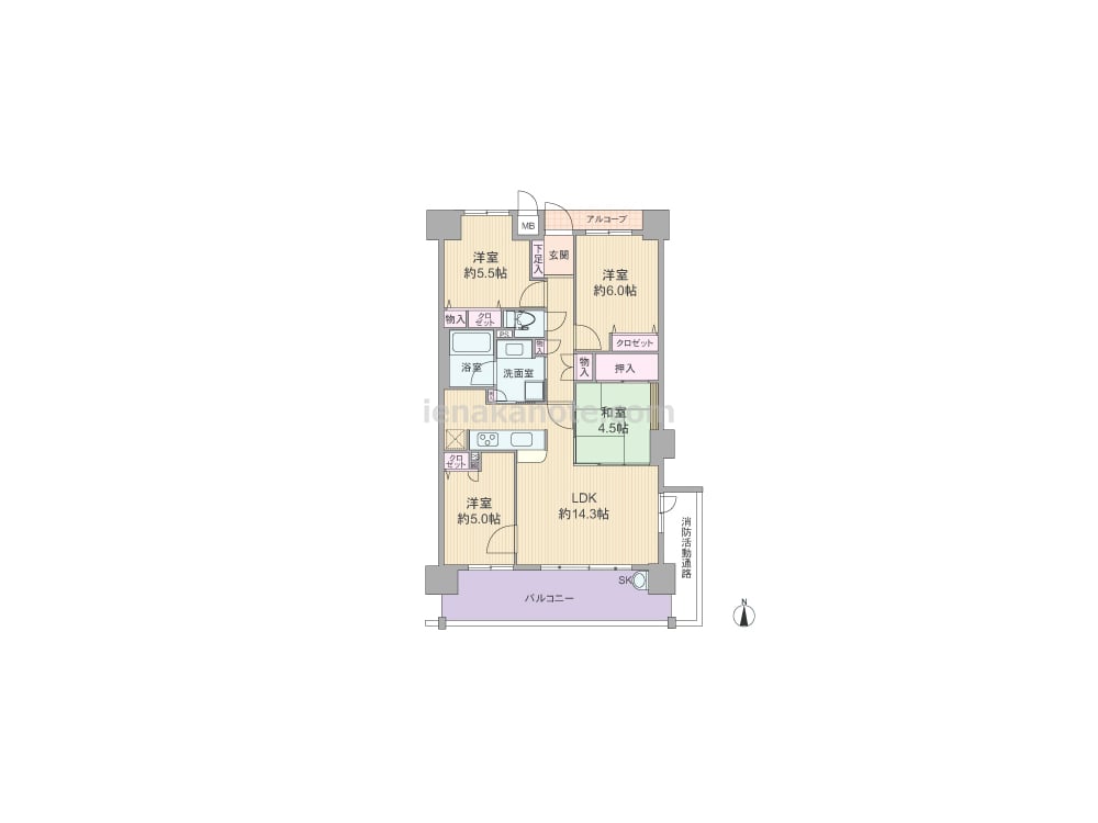 専有面積77.08平米の4LDK。玄関前にはアルコーブ付き。キッチンは半独立型で、リビングダイニングからの視線を適度に遮りつつ、家族の様子も伺える配置。キッチンから洗面室へもアクセスでき、家事動線にすぐれています。角部屋ではありませんが、リビングは2面採光。和室4.5帖は家族団欒のスペースとしても活躍します。バルコニーにはスロップシンク付きです。