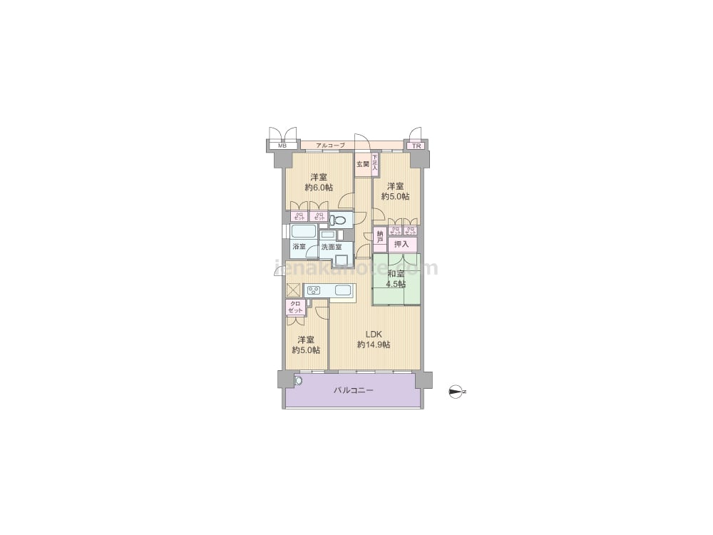 専有面積77.4平米の4LDK。玄関前にアルコーブとトランクルーム付き。LDK約14.9帖と続き間の和室の襖を開放すれば、LDK約19.4帖大にする事ができます。キッチンは洗面室にも行き来が可能な2WAY動線。キッチン横と浴室に窓があり、換気がしやすく快適。各居室と室内廊下に収納スペースが設けられています。バルコニー約13.3平米にはスロップシンクがあり、洗い物やガーデニングなどの利用に便利です。