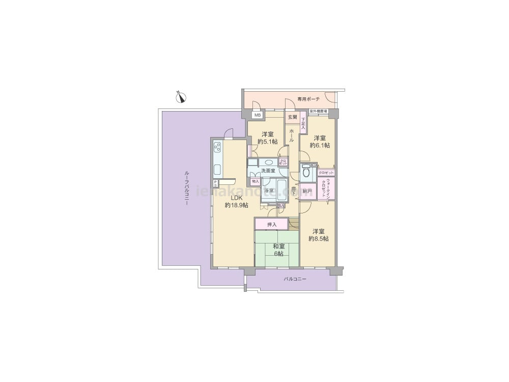 専有面積104.31平米の4LDK。玄関前に専用ポーチがあり、居室の窓が共用廊下に面していない、プライバシー性の高いプラン。LDK約18.9帖はルーフバルコニーに面しているため開放感があります。キッチンは洗面室にもアクセスでき家事動線の良い造り。和室6帖は個室や客間、LDKとつなげて約24.9帖の一つの空間にするなどフレキシブルに使えます。収納スペースが豊富にあるのもポイント。ルーフバルコニーは約57.53平米と大変広く、ガーデニングや家庭菜園、アウトドアリビングなど色々な楽しみ方ができます。