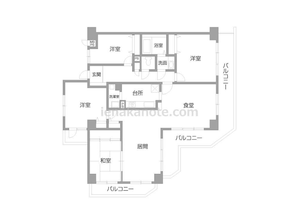 4LDKのプラン。リビングスペースとダイニングがゆるやかに仕切られており、独立型のキッチンは生活感がリビング・ダイニングに伝わりにくいのが特徴。キッチン横に洗濯機置場があり、家事効率にも配慮されています。リビングと続き間の和室は、個室の利用はもちろん、襖を開放してくつろぎのリビングスペースにしてもよさそう。ワイドバルコニーはガーデニングをたっぷり楽しめます。