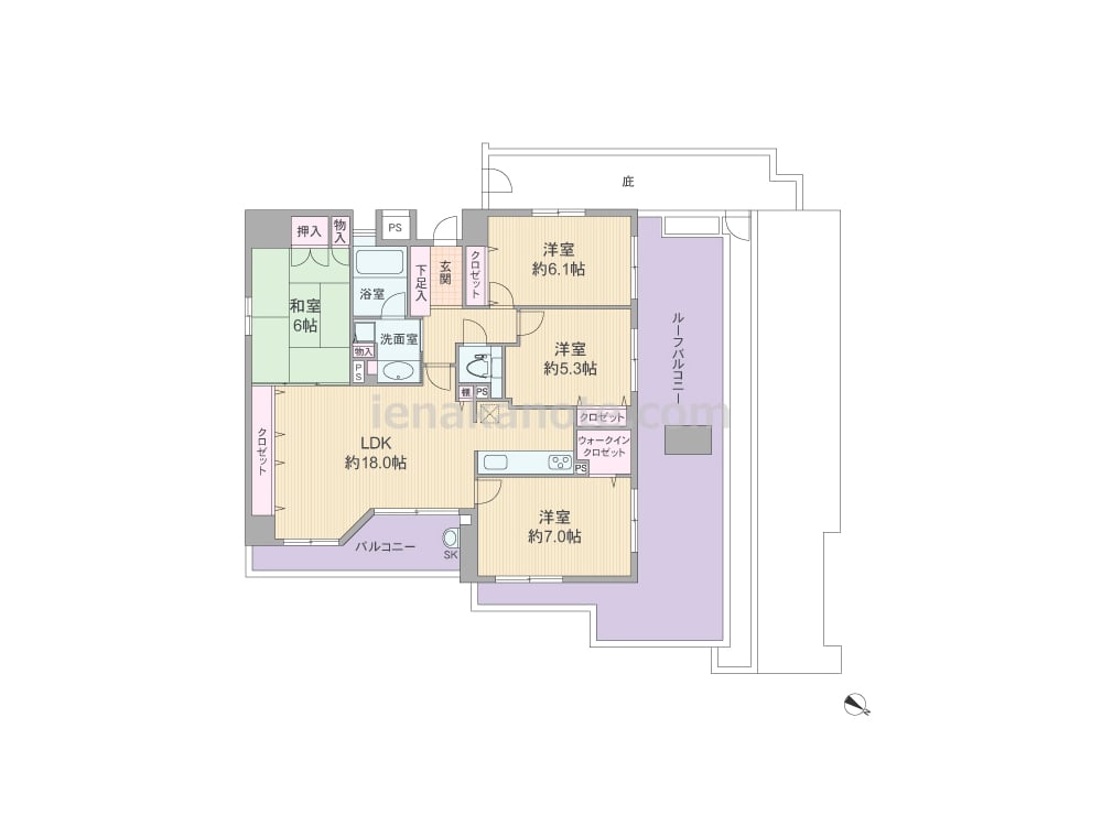 専有面積90.12平米の4LDK。LDKと洋室3部屋がバルコニーに面するワイドスパンのプラン。LDK約18.0帖には和室6帖が隣接しており、引き戸を開放すれば約24.0帖大の空間にする事が出来ます。生活感の出やすいキッチンは独立型。収納が豊富にあるのもポイントです。浴室の窓は湿気がこもりにくく快適。バルコニーにはスロップシンクがあり、ルーフバルコニーは約32.91平米と広く、ガーデニングや家庭菜園、アウトドアリビングなど色々な楽しみ方が出来ます。