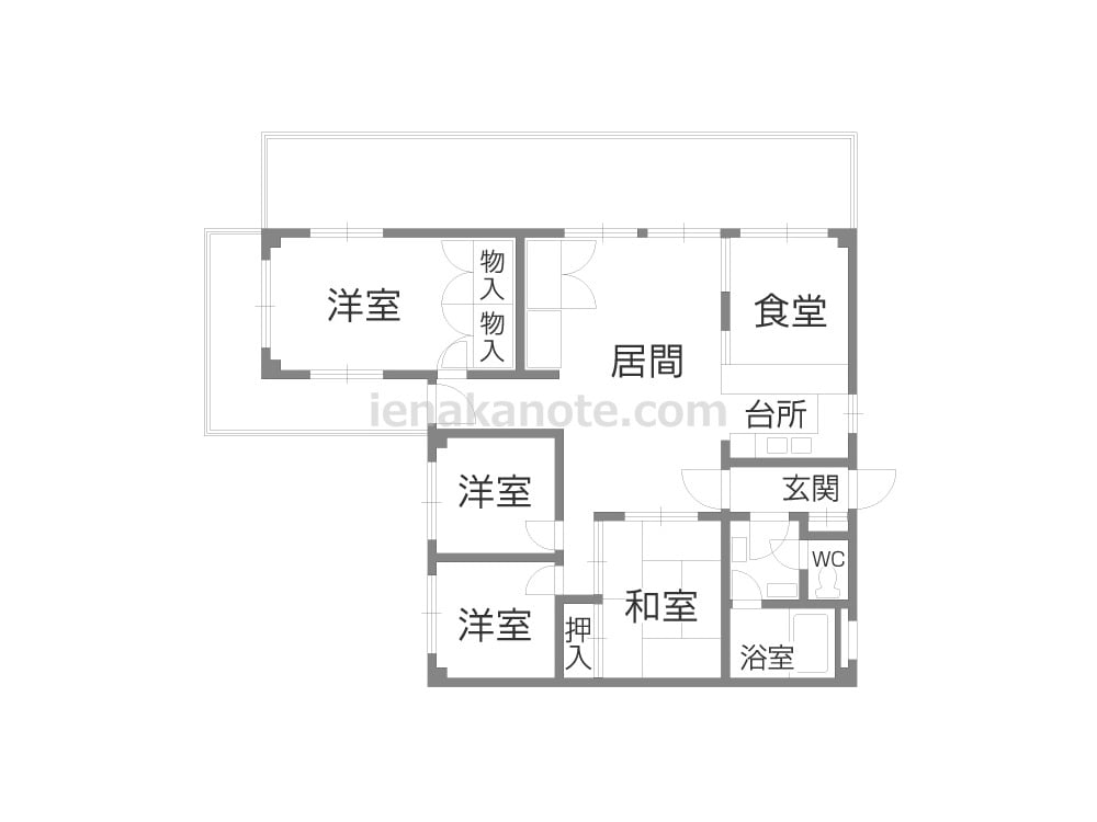 玄関ホールを抜けるとリビングが広がる、家族の動きが分かりやすい4LDKのプラン。キッチンは奥まって配置されており、ダイニングもゆるやかに仕切られているため、リビングはくつろぎの空間を保つ事が出来ます。和室は2カ所から出入りでき、引き戸を開放すればリビングスペースをより広々と使う事が可能。和室に近い洋室2部屋は収納が無いため、家具の配置など少し工夫が必要です。主寝室は3カ所に窓が付いた明るく開放的な一室。サニタリースペースへは玄関ホールを通ってアクセスします。