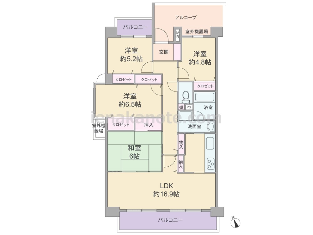 専有面積88.74平米の4LDK。玄関前にアルコーブがあります。横長リビングのプランで、LDK約16.9帖に隣接する和室の引き戸を開放すれば、約22.9帖大の空間にする事も可能。独立型のキッチンはリビング・ダイニングに生活感が伝わりにくく、キッチン横から洗面室へアクセス出来ます。収納が豊富にあるのもポイント。バルコニーが2カ所あり、南側バルコニーはスペースにゆとりがあります。