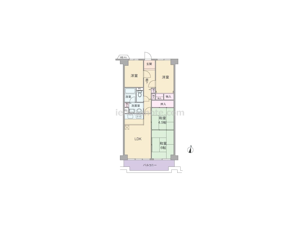 専有面積72.00平米の4LDK。LDKと和室2部屋が続き間になったプラン。それぞれ個室にしたり、襖を開放して部屋を広々と使うなど、生活シーンにあわせて自由にプラン変更できます。キッチンはI型の壁付け・オープンタイプ。北西側洋室と、和室6帖には収納スペースが無いため、家具を置くなどの工夫が必要です。