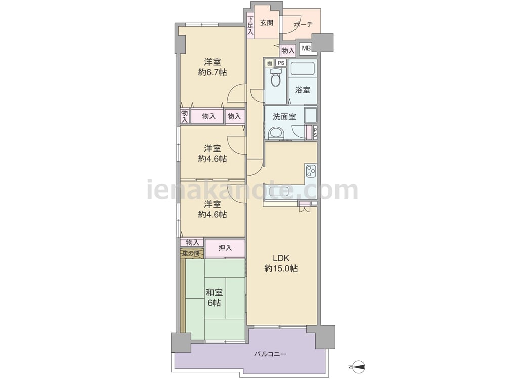 専有面積85.62平米の4LDK。共用廊下に居室の窓が面しておらず、玄関先から室内を見通せない、プライバシー性の高いプラン。LDKは約15.0帖、キッチンはL字型の対面カウンター式。キッチンから洗面室へアクセス可能な2WAY動線です。和室6帖の板間は家具を置くのに便利。洋室約4.6帖は引き戸を開放すれば約9.2帖の一室にプラン変更できます。収納スペースが各所にあるのもポイント。バルコニーは約10.98平米あります。