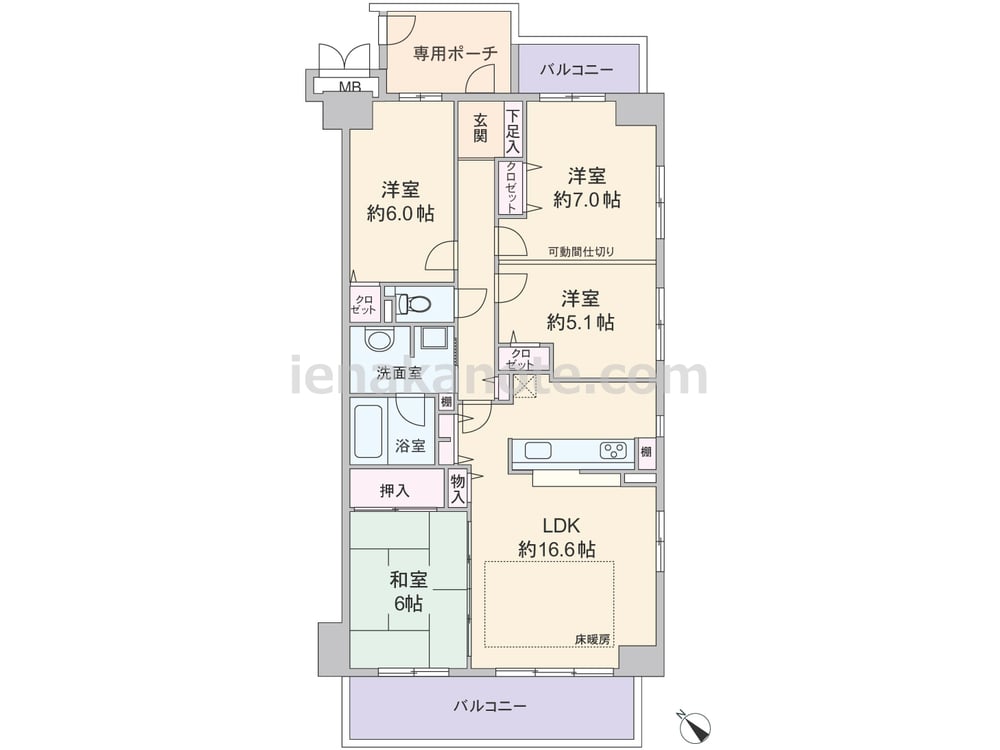 専有面積86.94平米の4LDK。玄関前にはポーチ付き。南西・北東両面にバルコニーがあります。キッチンはカウンタータイプ。LDKには和室6帖が隣接しており、襖を開放すれば、約22.6帖の空間としても使えます。各部屋に収納が確保され、リビングや廊下にも物入があり、収納が豊富です。