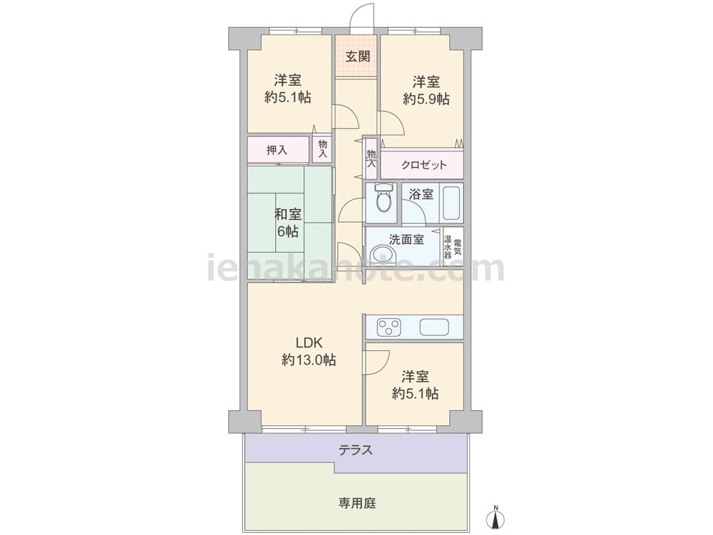 専有面積78.00平米の4LDK。専用庭付きのプラン。キッチンは独立型。LDKと和室6帖が続き間で、一つの空間としても使用可能。専用庭は、ガーデンスペースや家庭菜園、子どもの遊び場にもピッタリです。