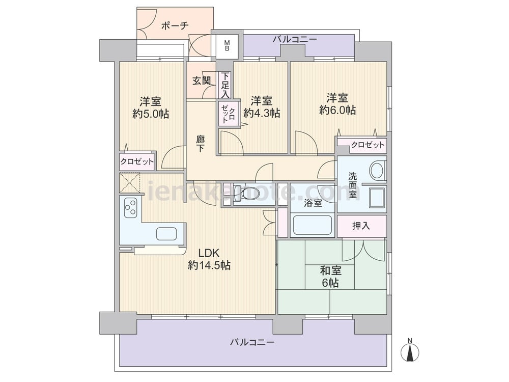 専有面積80.08平米の4LDK。玄関前に専用ポーチがあり、南北両面にバルコニーの付いたプラン。共用廊下に直接面した居室がなく、約6帖の主寝室と和室が2面採光。LDKと3部屋がバルコニーに面しています。またキッチンはL字型のカウンタータイプ。各居室に収納スペース付き。LDKと和室が続き間で、約20.5帖の一つの空間としても使えます。