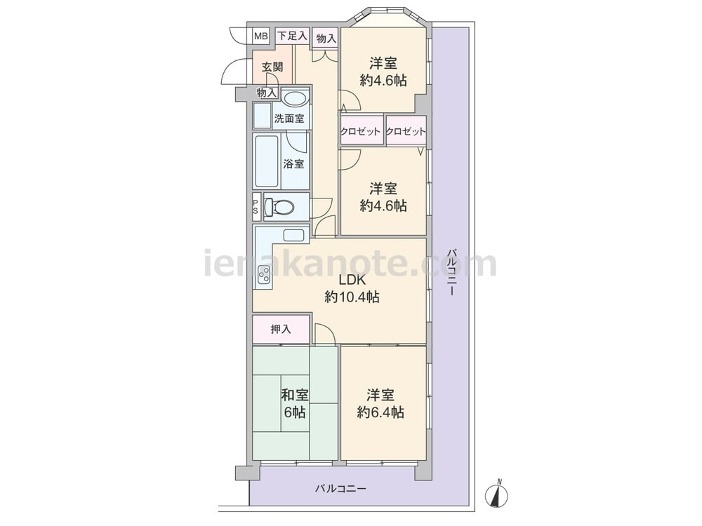 専有面積72.24平米の4LDK。バルコニーはL字型で間口が広く、物干しスペースに困りません。キッチンは家事効率の良いL字型。LDKと洋室が続き間になっており、引き戸を開放すればリビングを広々と使えます。