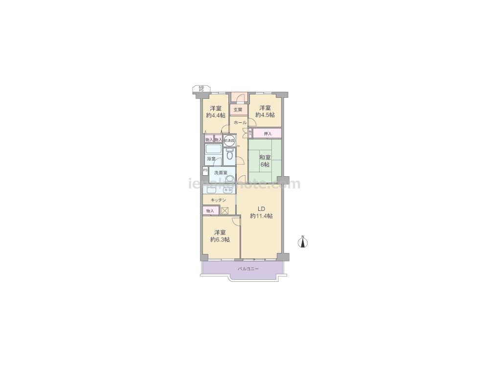 専有面積80.82平米の4LDK。キッチンは独立型。リビング・ダイニングと和室が続き間で、一つのスペースとしても使用可能。約6.3帖の主寝室はバルコニーに面し、明るく、開放感があります。