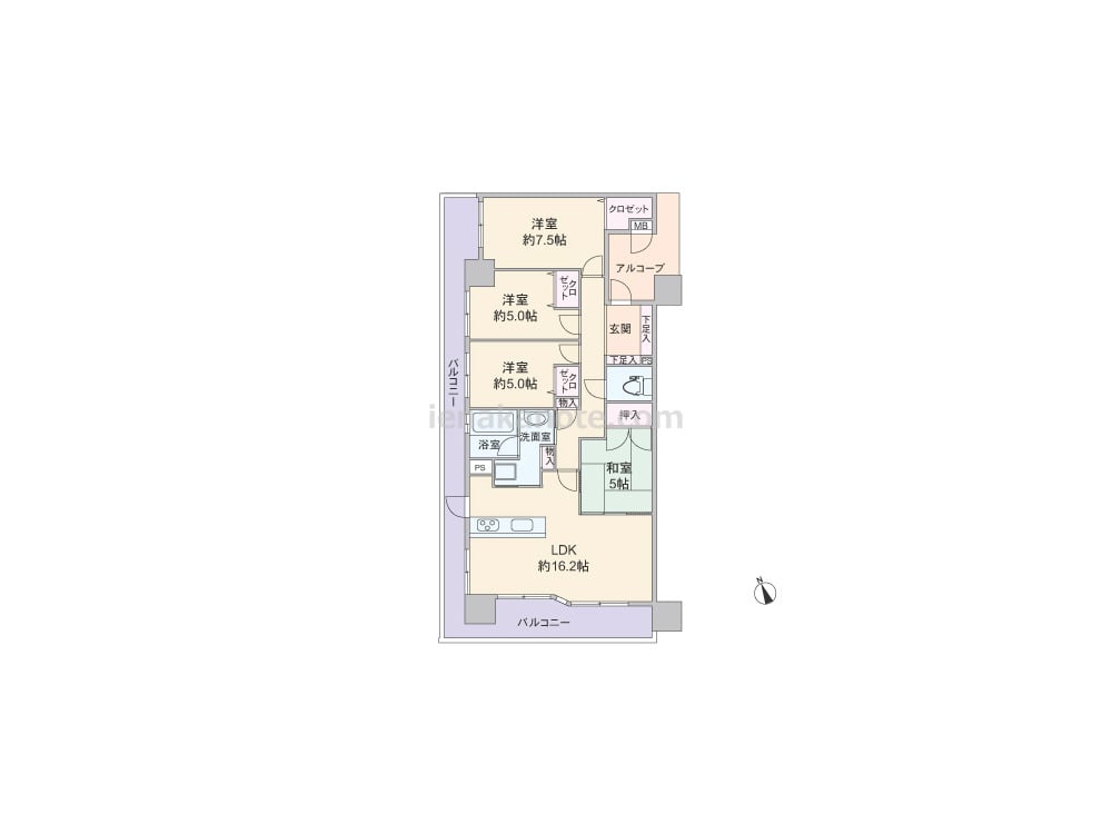 専有面積87.46平米の4LDK。玄関前にアルコーブがあり、共用廊下に面する居室が無く、プライバシーに配慮されたプラン。LDK16.2帖は南面・西面が空いており開放感があります。キッチンはカウンタータイプで、バルコニーへの勝手口と、洗面室へ行き来が可能な家事効率の良い3WAY動線。浴室にも窓があり換気がしやすく快適。主寝室には大きめのクロゼット、洗面室収納や玄関に下足入れが2ヶ所あるなど収納スペースも充実。バルコニーはL字型で、全室がバルコニーに面しています。