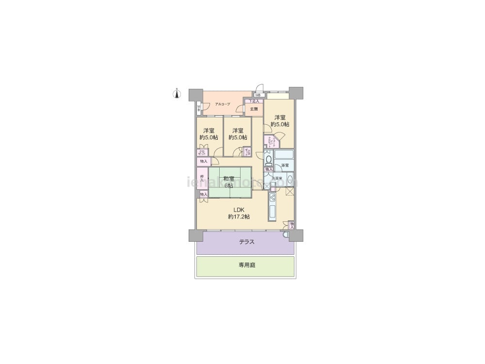 専有面積95.93平米の4LDK。玄関前には広々としたアルコーブがあり、プライバシーに配慮されたプラン。テラスと専用庭は子供の遊び場やガーデニングスペースにぴったりです。LDKは17.2帖、キッチンはカウンタータイプで、バルコニーや洗面室へ行き来のしやすい家事効率の良い3WAY動線。LDと続き間の和室は、襖を開ければリビングの延長としてゆったりと使えます。ウォークインクロゼットやトランクルーム、ストックルームがあるなど収納スペースが充実しています。
